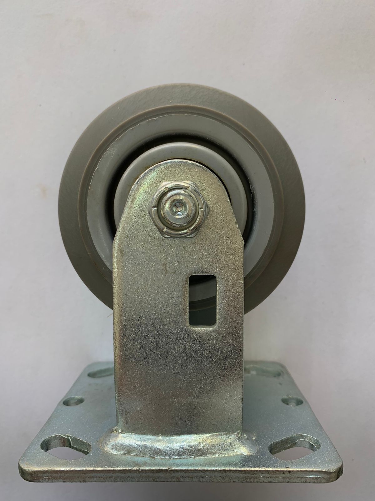 HERRAJE FIJO De lámina de acero inoxidable grado 304. Resistente a la corrosión de ambientes salinos y húmedos. Plantilla de fijación medidas: 2 3/8 de ancho por 3 5/8 de largo. RUEDA Medidas: Diámetro 4; Ancho 1 1/4; Largo del centro 1 9/16. Recubrimiento de Goma Gris 75 Shore A. No mancha Pisos. Balero anular de bolas. Capacidad de carga unitaria: 250 lbs / 114 kg.